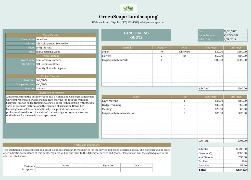 - Large-scale residential projects: When designing and implementing comprehensive garden makeovers, including hardscaping, planting, and irrigation systems, an itemized quote sheet is indispensable.