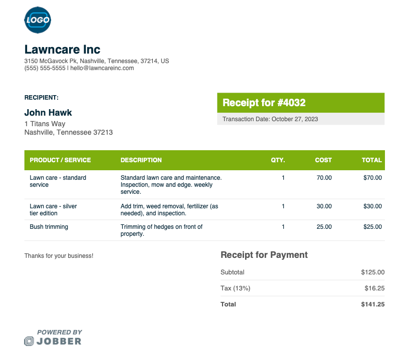 • Upon Completion of Service: Immediately after a lawn mowing, trimming, or general landscaping service, providing a receipt confirms the work was done and payment received.