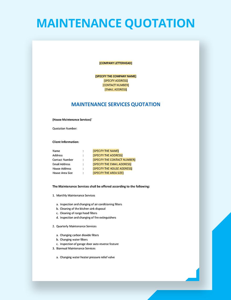 A well-structured maintenance quotation template is far more than a simple price estimate; it is a critical component of professional communication and effective business operations. By providing a clear, concise, and comprehensive overview of services and associated costs, it establishes a foundation of transparency and trust between providers and clients. Its standardized format ensures consistency, reduces administrative burdens, and acts as a robust tool for record-keeping and legal protection, ultimately bolstering the credibility and efficiency of any service-based enterprise.