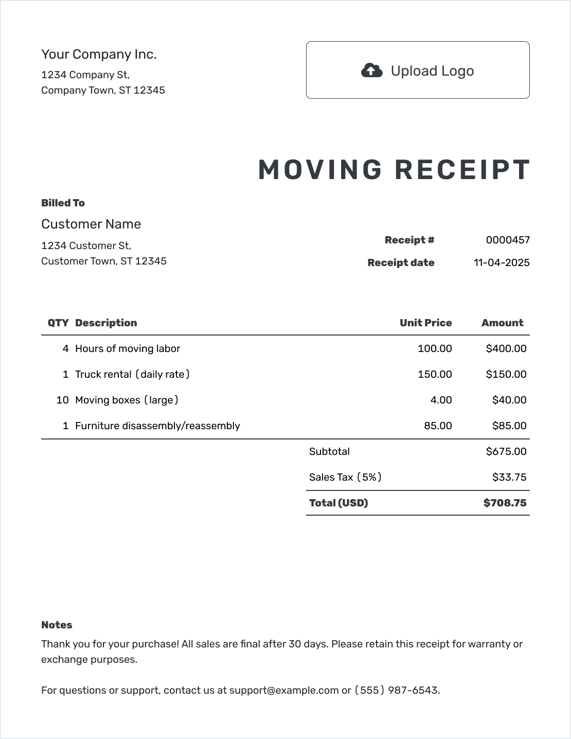 Free Customizable Moving Company Receipt Template