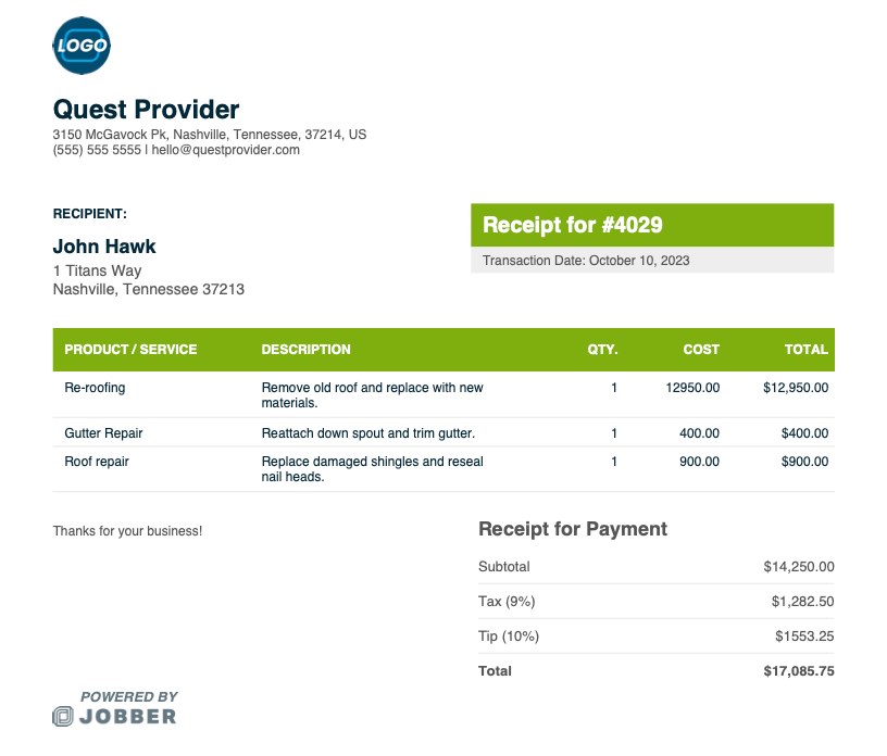 • Completion of a New Roofing Installation: Providing a detailed receipt upon the final payment for a brand-new roof, itemizing all materials, labor, and associated costs.