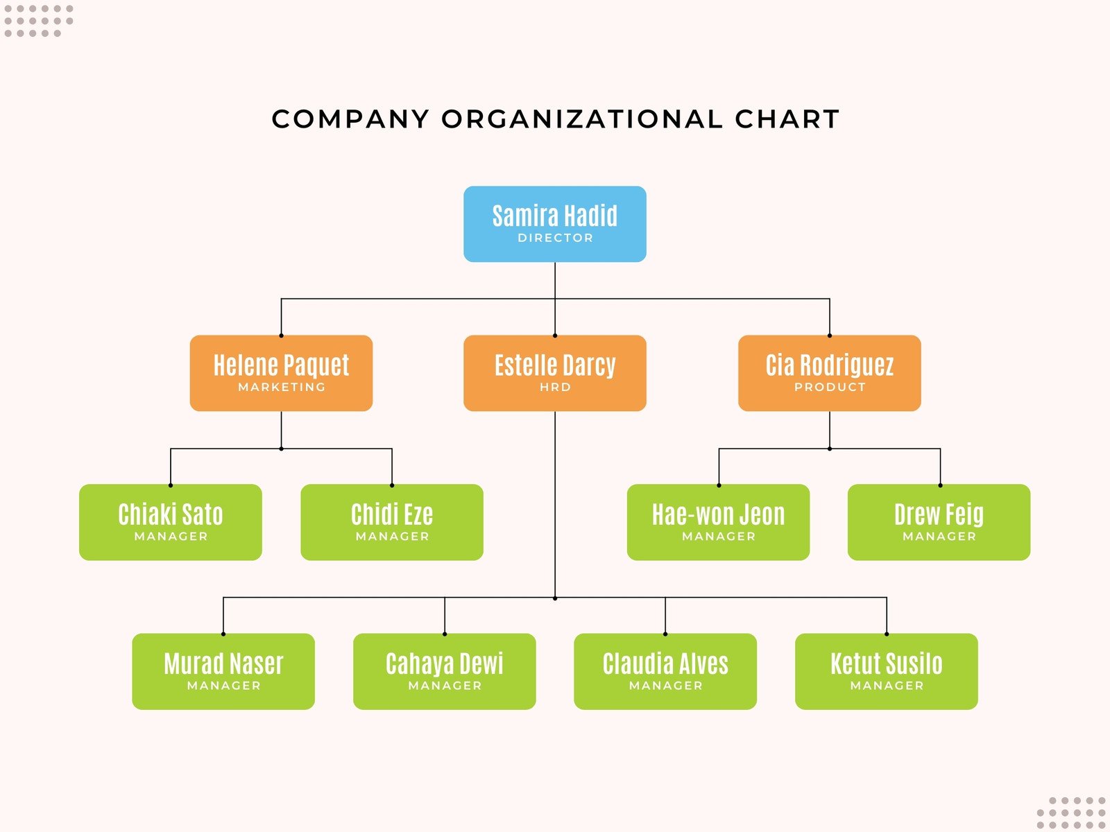 - Onboarding New Employees: Provides a quick and clear overview of the company’s structure, helping new hires understand their place within the team and identify key contacts and reporting lines.